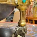 Our client's beautiful German baptismal font dating from the late 19th century is crafted from bronze, gilt metal and copper and inlaid with semi-precious stones and raised on patinated bronze Chinese or Japanese inspired guardian lions.