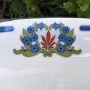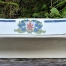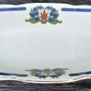 "Prestwick" pattern celery, or relish dish, made by Grindley China of England. Marked "Georgian Ivorie", registered in 1924. Measures 10 7/8"l x 1 3/4"h. Blue bands and flowers, red-orange and green leaves. Metallic gold trim. No chips or cracks, though some wear to gold trim. Sold as is. Inglenook Antiques...Established 1989.