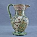 Antique 1920 to 1935 Italian Renaissance Revival glazed ‘Sgraffito' pottery wine pitcher. A well-potted baluster shaped body raised on a splayed foot with a concave base, with a tall flaring neck and shaped spout, applied curved handle; exterior decorated with carved and incised floral and checkered design highlighted with yellow, green, cream, brown and green splash glaze. Signed on the bottom with incised SCAP (Società Ceramica Artistica Pisana) mark.
