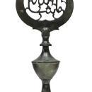 Our charming nineteenth century bronze alam (finial ornament for a processional or battle standard) on stand features the Arabic phrase Mashallah (also written Masha'Allah) in reticulated characters inside a stylized palmette. It measures 20 by 8 by 7 inches and has a fine old patina.