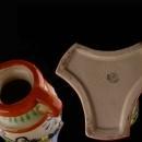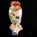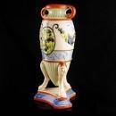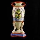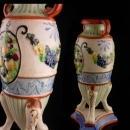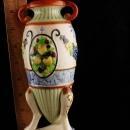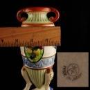 This is a really ornate greek style vase Made in Japan. I think the mark is Nippon ( see photo). Beautiful colors and lots of detail make this something you would love to see shown off in a glass lighted cabinet. See photos for sizes and condition.