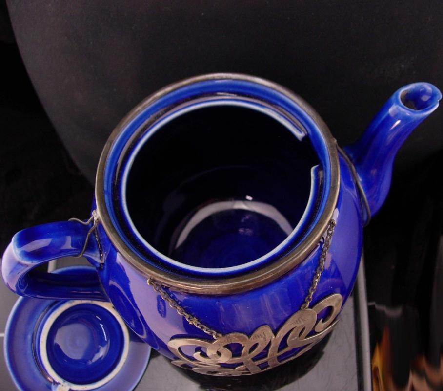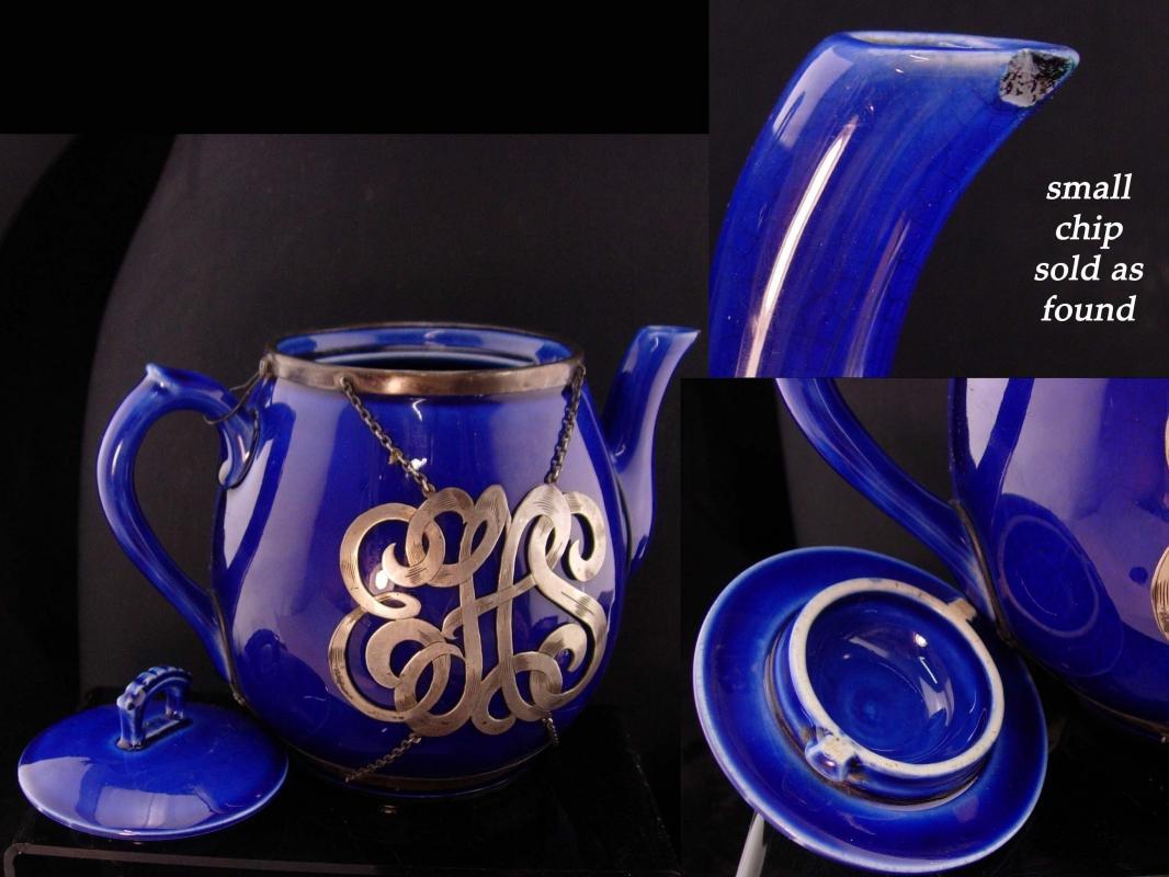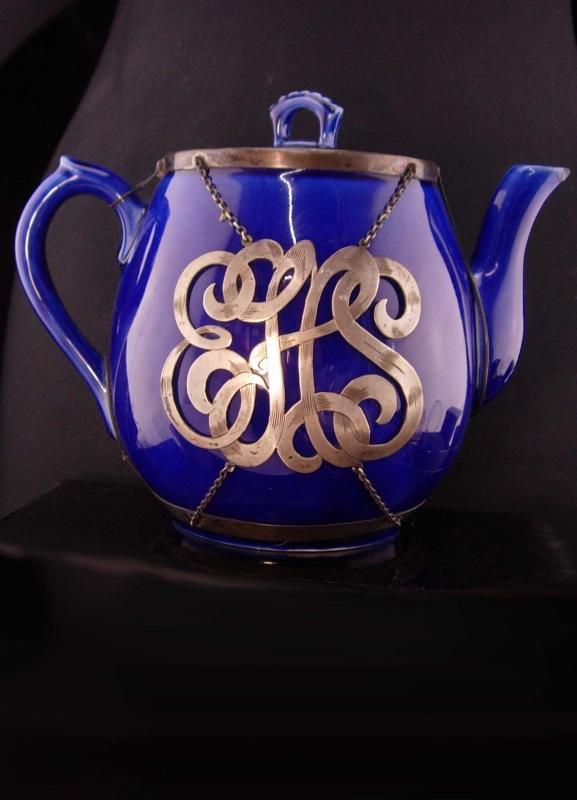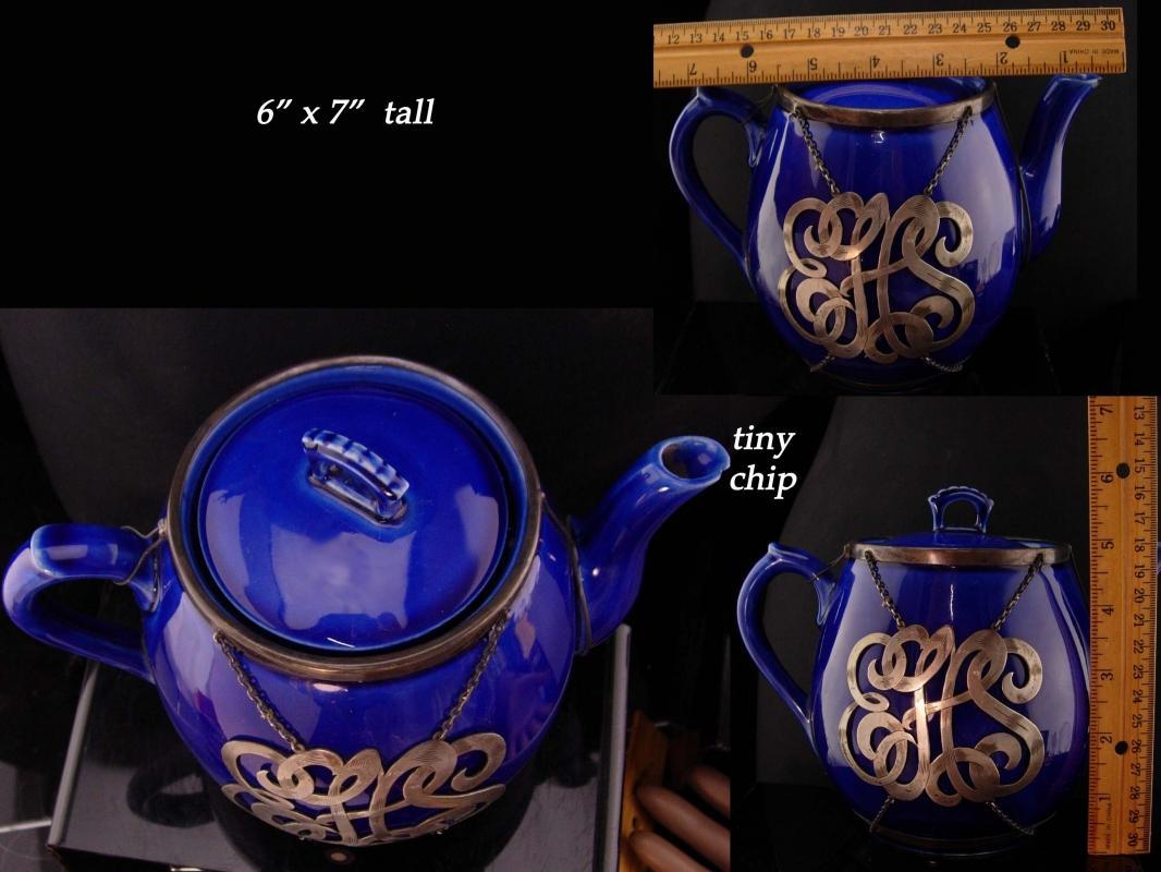 Antique Personalized silver overlay Victorian teapot - ELCS initial silver cobalt blue kettle - Anniversary Gift - housewarming dinnerware