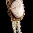 Antique pink carved cameo brooch pendant - 48" Pearl flapper Goddess necklace - Wedding Bridal Pearl necklace
