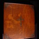 This large wood box is quite beautiful with ornate corners in brass and a brass cross on the top. Inside it appears are all the original contents. Imagine the history of this wonderful spiritual box .... See photos for more info on size and contents.