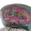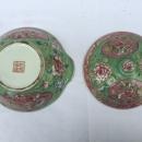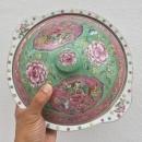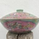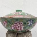 A green & pink Nyonya Covered Bowl, finely decorated with Phoenix in flight amongst Peony Spray background. For the Chinese these are auspicious symbols of prosperity and good fortune.