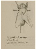 During the aesthetic period, jewelry was made using animals as figures and the more bizarre the better.I have taken a photo from Kaplan's Official Antique Jewelry guide where is shows a similar one in gold for $600.00 and up. This dimensional fly is marked GORHAM sterling on the back and is covered with 18kt gold leaf. The fly is almost 1" long and this is heavy and well made. Very little gold wear too. THis measures 2" long. Ask about our ten percent off special, it could save you a lot of money. VintageSparkles offers Layaway on all our Etsy pieces regardless of which site it comes from.All layaway payments will need to be in the form of a check or money order only. Please remember that vintage & antique items are not mint, nor are they perfect but they sure are full of old history and charm. Please use photos to make your decisions and read our policies prior to buying so you can have an excellent experience with us. Please use this number when ordering ga33710. If you want to see more of these pretties this is the link to my etsy store. http://www.vintagesparkles.etsy.com/