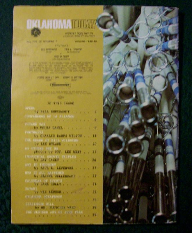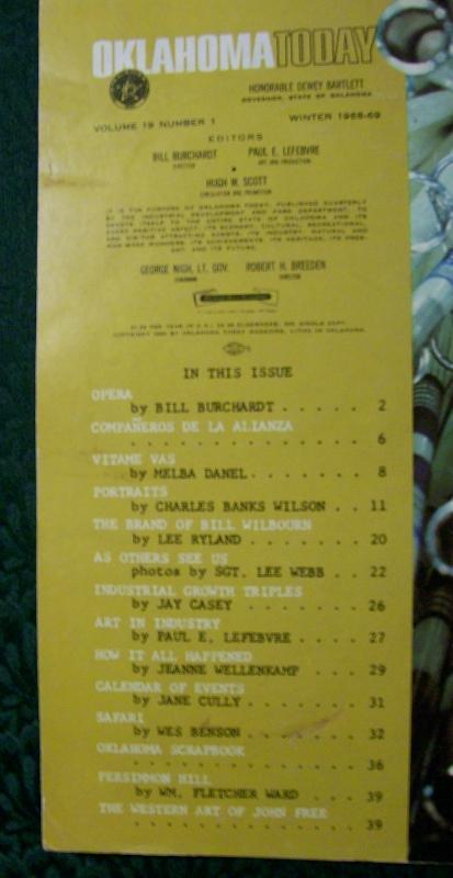 "Oklahoma Today" magazine, Winter '68-'69. Volume 19, No. 1. 39 pages. Color and black & white graphics. Scratch down length of front cover as shown. Otherwise in good condition. Sold as is. Inglenook Antiques...Established 1989.