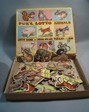 Old lotto animal box & pieces. This was originally a set of 4 puzzles with the heavy old cardboard animals. The puzzles were thrown away & the pieces were used as a teachers aid in teaching children about different species of animals. There are a couple with the names (like fox, kangaroo et) on the back so you could hold them up & ask what they were. There are 36 animals including domestic such as horse & dog, farm such as sheep & goat, and wild animals. There are 2 with bent corners, otherwise pieces are great, box is dirty and corners have been taped. Great detail & litho work on these pieces. Each one is aprox 2 x 2"