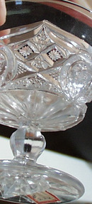 Old Pressed Shebet, Crystal with a star pattern on foot and a diamond and star pattern on side with a drape look and rose type flower in medallion. Very ornate and pretty. Excellent condition. 3 1/2 x 3 1/2""
