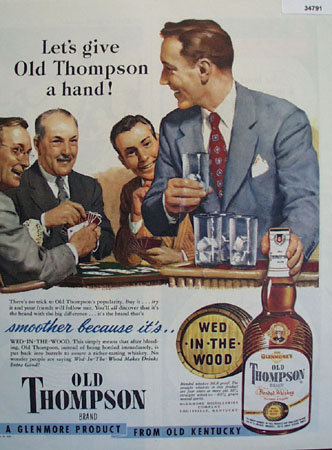 Old Thompson Whiskey A Glenmore Product 1949 Ad. This color October 11, 1949 ad states Lets give Old Thompson a Hand. Theres no trick to Old Thompsons popularity. Smoother because its Wed in the Wood. Picture shows 4 men Playing Cards. One is holding glass with ice reaching for Bottle of Old Thompson Brand Blended Whiskey. Magazine tear sheet picture is taken through plastic and may show wrinkles or crookedness that is not in the ad. This Original magazine tear sheet measures 10 1/4 inches wide by 13 1/4 inches tall.
