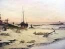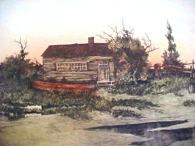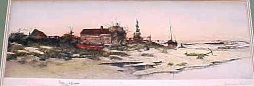 Offering this large wonderful old color print titled Ostermans Home - beautifully and intricately detailed sea shanty on the shore along with the boat and an old anchor setting on the shore. There are so many details that you could study this one for hours. Print is marked Oystermans Home in lower right corner and in upper left corner reads copyright 1891 Radtke Laucknri, Glou, NY. In the lower left margin is another tiny drawing similar to painting. Print is matted in new acid free green; original wood frame with mahogany finish; protective glass covering and wire hanger on back. Overall measures 38 1/2 inches x 19 inches; print as seen is 11 1/4 inches x 31 inches. Very good condition on print, no holes or tears, slight age toning, a couple tiny spots on margin which does not affect looks. Frame has some scuffing on one side, but has had a coat of polish to darken the area, just adds to the charm and age of this piece of art. A wonderful old print for your seaside cottage!