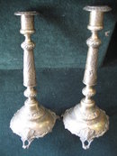 Pair of marked .84 fine antique candlesticks signed "J. Ehrlich". Russian candlesticks of ornate design with swans and fish in a lake setting with cat tails and insects. Leaf, stem, and berry work at the base, floral work at the turnings, and scrolled leafwork at the upper part. In fine original condition with no signs of restoration, clear signature, normal minor surface abrasions to each. Dimensions: 14.5" in height and 6.75" diameter at base.
