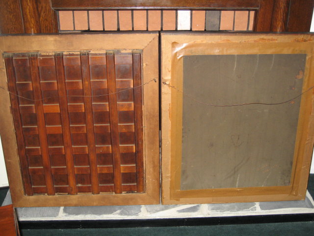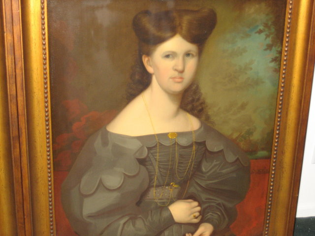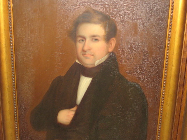 Pair of portraits American circa 1830 in original frames. Wonderfully executed pair in distinctive dress, circa 1828-1835. Both paintings are in original condition with original varnish still intact with just surface cleaning. The portrait of the gentleman has a period bird cage bridge for support of the board on the back. [This is a fairly common early 19th Century mid 19th Century method of de-stressing the board from future damage.] The female portrait can be seen from reverse in its original board and original frame. A striking example of Americana early 19th Century. Dimensions: 29 by 34 framed each.