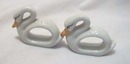 Pair of swans Napkin rings, Newer product, but so graceful I had to include them in the collectible realm of antiquing. What I like most is that you can let them sit on a counter or shelf & they are decorative as well as useful when you need them. These are porcelain with hand painted yellow beaks & black eyes. Mint condition, 2 3/4 x 2"