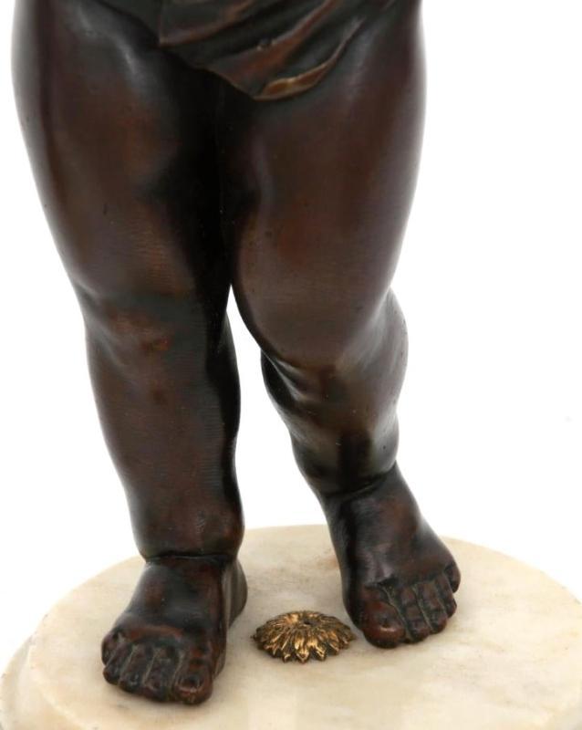 Our pair of patinated bronze figurines of putti, in the manner of Clodion, are mounted on round marble pedestals, measure 14.5 inches (36.8 cm), and date from the nineteenth century. One is missing a plug that secures the top to the bottom halves of the body. Originally fitted as table lamps.