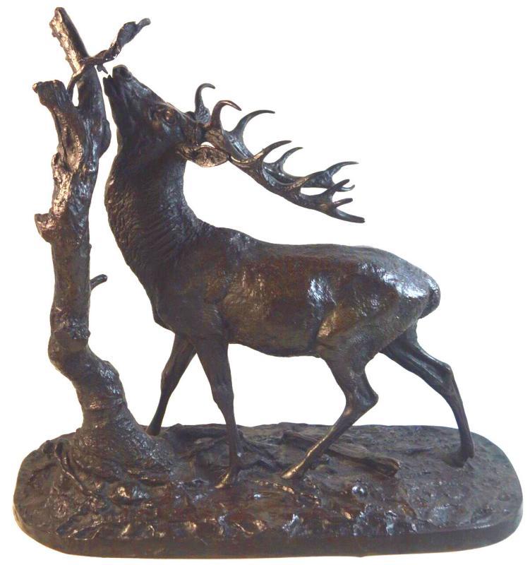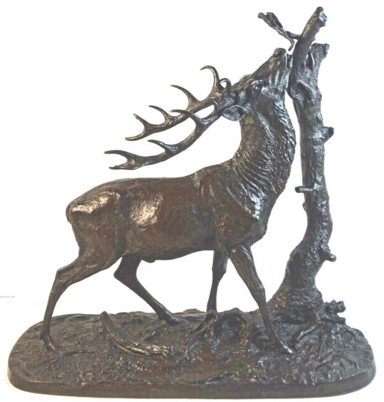 Our patinated bronze of an elk after Pierre Juls Mene (1810-1879) measures 14.5 in tall, 15 in wide and 7 in deep. In good condition.