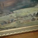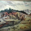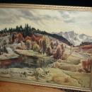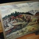 Paul Lauritz 1889 - 1975 Fine Art Landscape Painting, Framed in Wooden Gild Frame behind glass. It is a fall mountain landscape. I am not sure if this is in the California Sierras but that was an area the Paul Lauritz concentrated in. The trees that show a yellow , I believe are larches. This is a signed Lithograph printed in the USA. . The condition appears to be near excellent. The back side of the paper is yellowed and is slightly brittle. The nails that hold the litho in place are rusted. The protective dust wrapping on the back is missing but there is a cardboard layer holding it in. It is beautiful in this lovely gilt wood frame. It measures 18" x 23" including the frame.
