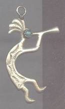 A nice little pendent or charm of a favorite native American character. This is the Hopi's Kokopelli, the flute player. He is not marked in any way as to maker or metal content. I do not believe he is made of sterling. It just looks like a base metal stamping. His eye is a nicely sawtooth bezel set stone. I believe it is most likely plastic. Inexpensive, but nicely styled. It measures approx. 1 3/4"X1". The shipping fees quoted are for first class/No insurance in the USA only.