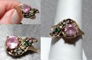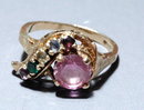 Pink Sapphire & Multi Gemstone & 10K Gold Ring. It is size 6 3/4. The center stone is Genuine Pink Sapphire that is 5mm in diameter. The smaller stones are of amethyst, citrine, emerald, aqua marine,topaz. The smaller stones are in a swag design that swoops over the larger pink sapphire. All stones have been tested and are authentic.