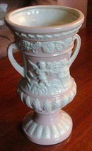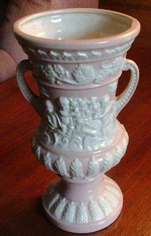 This 8 inch vase is a soft pink with different white cherub designs on both sides. It is stamped Made in Japan on the bottom. Could find no nicks, chips or cracks anywhere on the piece and the color is not faded at all. Just beautiful.