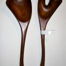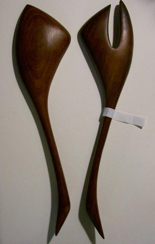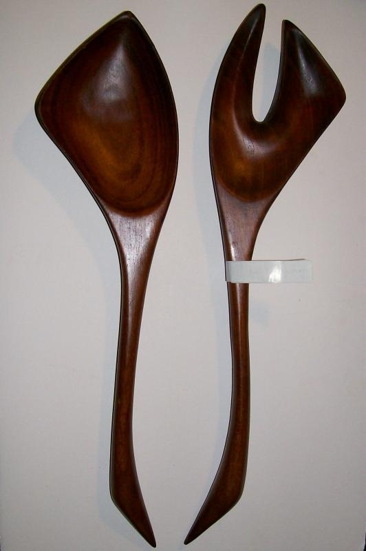 Monkeypod wood fork & spoon for serving salad. Handcrafted in Hawaii or Polynesia, circa 1950's-60's. Each measures 13.5"l. Some small chips to edges, but no major damage. Sold as is. Inglenook Antiques...Established 1989.