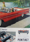 Pontiac Wide track Wheels 1958 Ad. This color two page November 10, 1958 ad states Trim, tailored, terrific and Americas Number one Road Car. Exclusively yours, wide track wheels and Solid quality Body by Fisher. Picture shows Man in Red 1959 Pontiac Bonneville Convertible beside Lake with sail boats at Pier. Magazine tear sheet picture is taken through plastic and may show wrinkles or crookedness that is not in the ad. This original magazine tear sheet measures 10 1/4 inches wide by 14 inches tall.