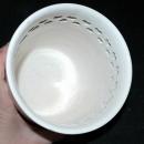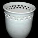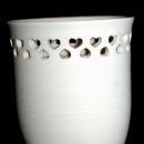 Beautiful cream colored wheel thrown stoneware pottery bowl with a band of cut work heart circumfusing near to top.