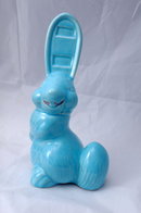 Pottery Rabbit Thermometer Holder. It is strange looking. The expression on the face is almost freaky. It must resemble some vintage cartoon character. The long ears are together to form one. There is where a paper small thermometer would go. The thermometer is missing but another one could be glued in very easily. Or you can use it for something else. The condition is good with the exception of paint wear on the red mouth. The pottery is thick and it is heavy for the size.