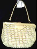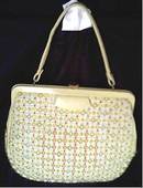 WOW!!! What a blast from the past! I was a little kid, but I remember these sort of bags! For those who love to dess in period and vintage 1960's clothing, this is an excellent Spring/Easter accessory. The cloth rsembles a needlepoint done in "baby yarn", meaning the size of the yarn. It is done in the colors of lemon yellow, orange, a bit of peach, a bit of an aqua blue, a dark green and that 1960's "poop" green. Sorry! But I could not think of any other way to decribe it! It has brass bun "feet" and yellow vinyl accents and handle. The inside is a yellow fabric, woven like grosgrain ribbon. It is solied, but intact. It has several pockets, including one containing what I believe is the original clear plastic comb. It has one zipper pocket. The handle has some greening where it has rubbed the brass hardware. Clasp is tight. There is some wear, but over all, in good condition. It measures approx. 9 1/2" tall by 11" wide and is about 1 1/2" thick. The handle is approx. 15" around from end to end and approx. 6" from clasp straight up to handle. The shipping fees quoted are for priority/No insurance in USA.