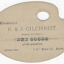 Victorian Die Cut Artist Palette Trade Card For R & J Gilchrist Dry Goods at the Old Stand 5 and 7 Winter Street, Boston, Massachusetts. Front Has Little Girl Feeding a Caged Bird. Back of Card has information. Card is 4" high and 3" across. Card is in good condition, wear at edges.