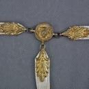 The frog consists of four loops, each featuring a gilt brass buckle that is intricately chiseled with scroll designs. At the top, the loops are adorned with gilt metallic cord, which is attached to a gilt brass suspension mount. This mount is elegantly decorated with a lion's head that showcases finely hand-chiseled details.