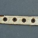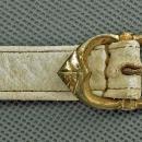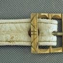 Rare antique 17th-century rapier sword belt carrier - hanger. The exterior is crafted from fine, soft leather, featuring white leather on the front and brown leather on the back. It is mounted with two gilt brass suspension mounts, intricately hand-chiseled with detailed designs, including a lion's head and acanthus leaves. The belt is secured with a hand-chiseled gilt brass buckle and a row of brass eyelets.