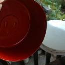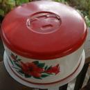 Sweet Vintage Cake Carrier. The top screws and locks on the plate and is carried by the bail handle on the lid. Lovely red hibiscus flower depicted on both side of it. As you can see the top is red. The condition is very good. There is some pain loss on the rim of the plate and there are a few nick and very shallow dings on the top of the lid.