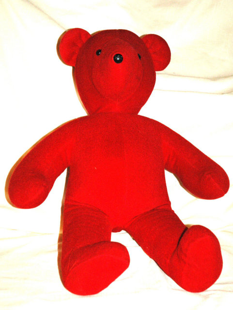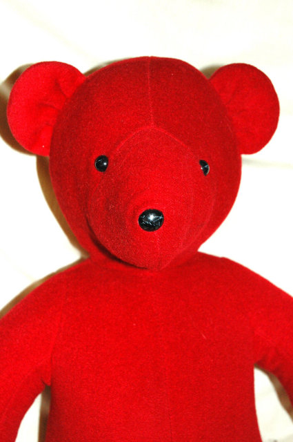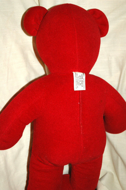 Cute 21" Red Designer Bear by Barbara Isenberg North American Bear Co. Chicago Illinois. It is made the USA. The outer fabric is of an short piled felt like fabric that is surface washable. It has button nose and eyes.