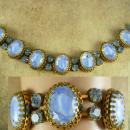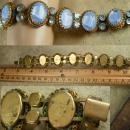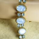 There is nothing I love more than seeing rich old czech brass filigree against Blue Givre Glass that changes color when the light hits it. These large glass faceted stones show off different shades like slag glass of cornflower blue.. The heavy settings are beyond beautiful with fancy ornate filigree work. Between each of the large settings are rich topaz colored deeply faceted prong set stones. The bracelet measures 7" long. As you see on the back it has not been finished with any gold plate. It is one fabulous vintage bracelet. Ask about our ten percent off special before you buy, it could save you a lot of money. VintageSparkles offers Layaway on all our pieces regardless of which site it comes from.All layaway payments will need to be in the form of a check or money order only. Please remember that vintage & antique items are not mint, nor are they perfect but they sure are full of old history and charm. Please use photos to make your decisions and read our policies prior to buying so you can have an excellent experience with us. Please use this number when ordering ga000593 . If you want to see more of these pretties this is the link to my etsy store. http://www.vintagesparkles.etsy.com/ or visit our gallery on pinterest where you can see all our pieces at once