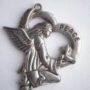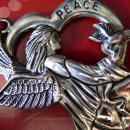 KNEELING ANGEL WITH WINGS HOLDING A DOVE SURROUNDED BY HEART WITH PEACE WRITTEN ON IT.