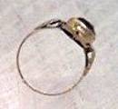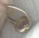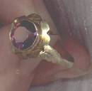 A beautiful victorian gold ring. A lovely floral motif setting with leaves on each side. The ring itself tested 14KT or higher by jeweler. The jeweler my partner consulted believes this is a really nice, very good quality amethyst. I am not a gemologist and do not know if what I see are small inclusions or tiny bubbles. The stone measures aprox. 3/8" across.(does not include the part under the bezel). The ring is aprox. a size 8 1/4. The shipping fees quoted are for Priority/Insured in USA.