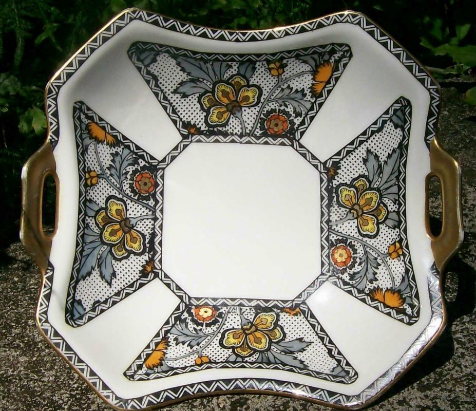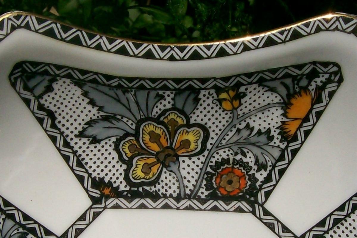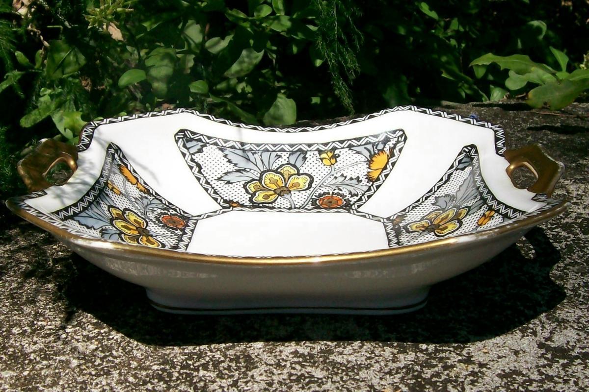 Noritake Art Deco 2-handled bowl, decorated with stylized flowers, black dots and zig-zags. Metallic gold trim. Circa 1930's. Unknown pattern. Measures 6.75" handle-to-handle, 8-sided shape. Mark on bottom. No chips or cracks, only some wear to the gold trim. Inglenook Antiques...Established 1989.
