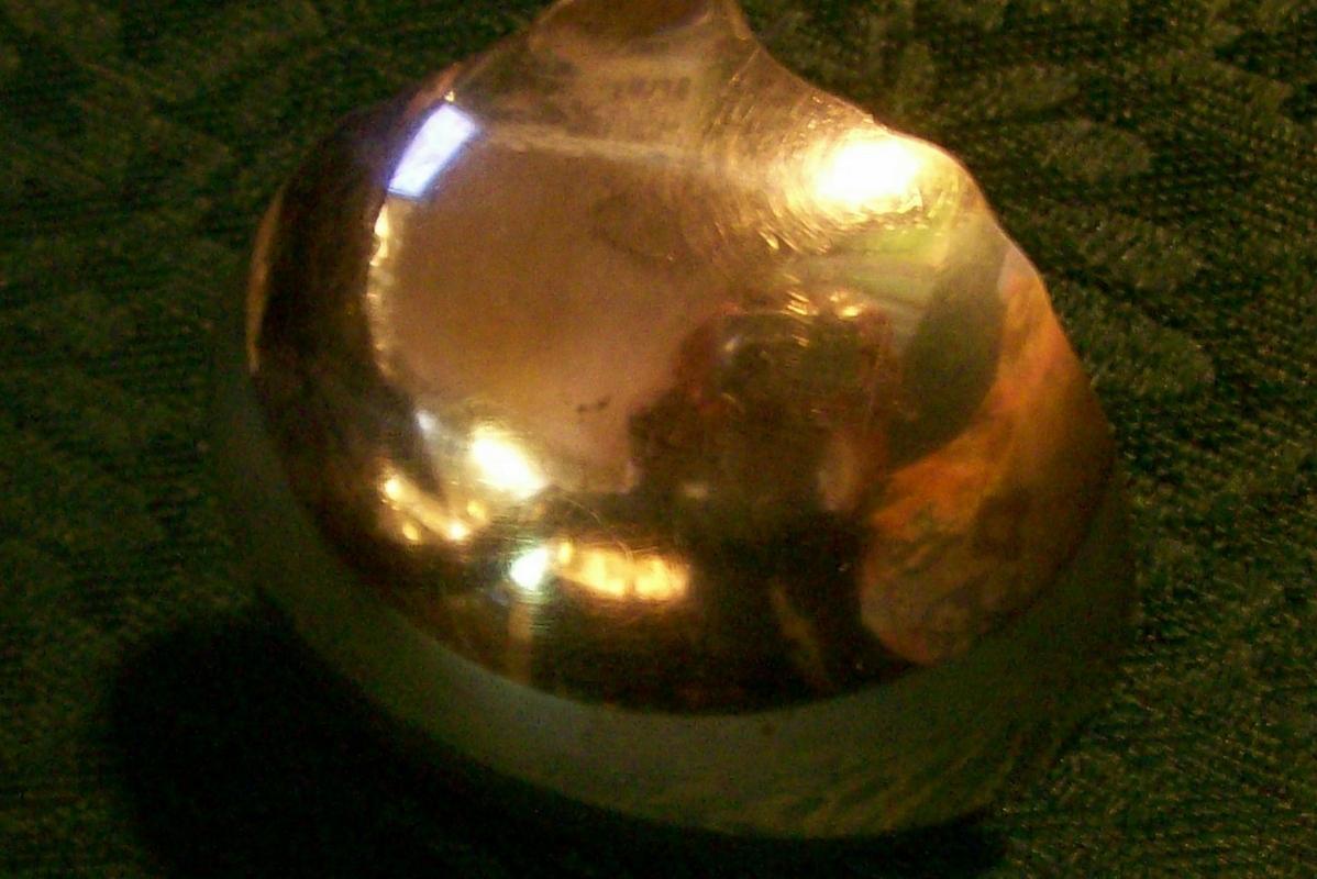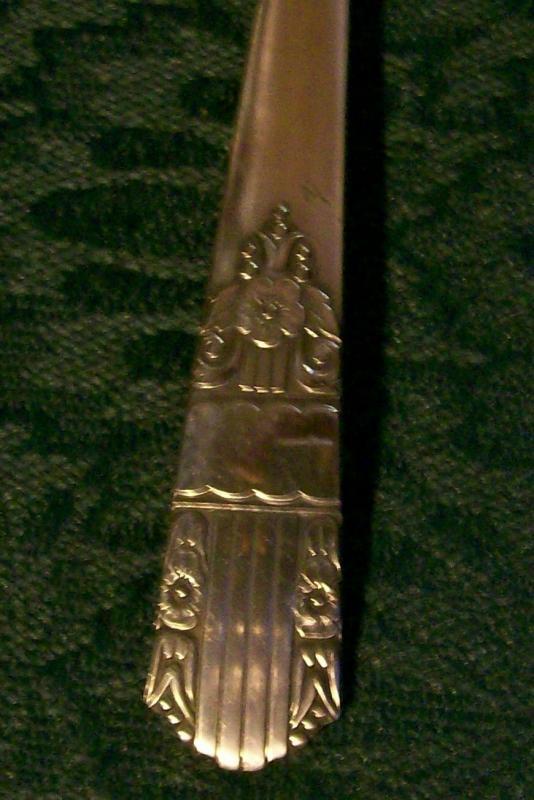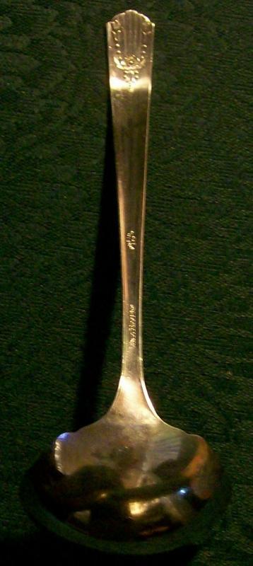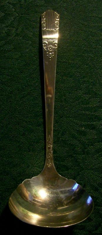 Silver plated gravy ladle in the "Harmony" pattern, made by Rogers circa 1938. Art Deco floral. Measures 7"l. Good used condition with no excessive wear through to the brass. Sold as is. Inglenook Antiques...Established 1989.