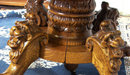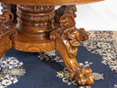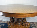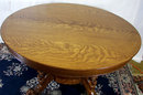 This is a Fantastic Quarter Sawn 53.5 Inch Round Oak Table from the turn of the century or before. It has one of the Best Bases that you will find with Detailed Carved Heads, Paw Feet, and is fitted with a shaped round Pedestal. It has been professionally refinished, and is in excellent condition. This table comes with its original four 10.5 Inch Leaves & Holder. The table has a turned Center Leg to support the leaves. The Table is 30.25 Inches Tall.
