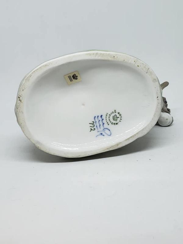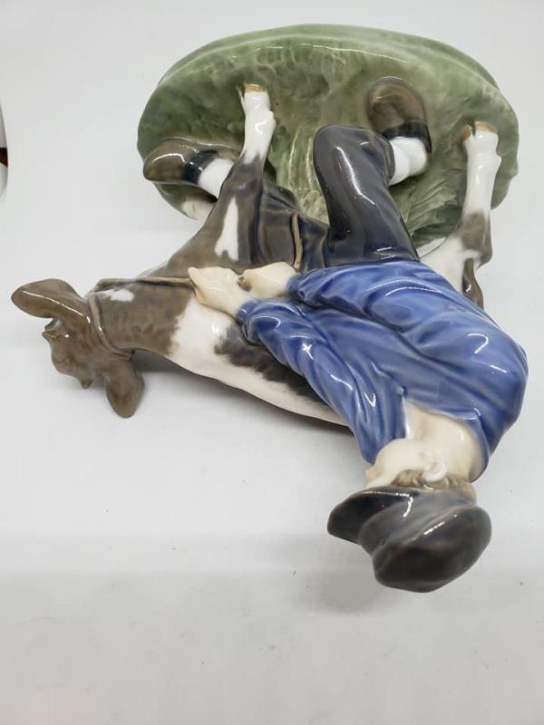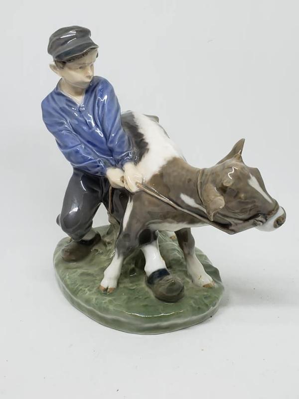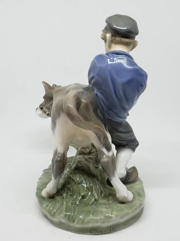This Royal Copenhagen pattern #772 is entitled Boy Walking in Field With Calf for the Farm Scene Collection. It was designed by famous Danish sculptor Christian Thomsen for Royal Copenhagen. The mark on the bottom indicates that it was produced in 1962. This piece is in excellent condition.