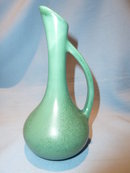 Lovely Royal Haeger RG 92 Slender neck Ewer Style Vase. Done in soft green matt finish with with darker green fleck. Measures 7 1/2 inches tall and is 4 inches across at the base. White inside. In excellent condition with no chips, cracks or repairs.