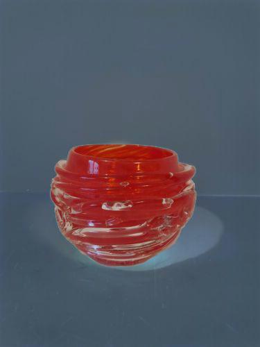 Merrilight votive blown glass vessels, hand crafted in Seattle by Merrilee Moore, are a blend of control and spontaneity. Organic lines of glass twist. Deep, lipstick, red encassed encased in clear glass ribbons and marked MM on the bottom. It is 3.5" tall x 4.75 wide and wieghs 1 lb 11 oz. The condition is excellent. I have found found similar piece by the same artist but this particular shade of brilliant red does not seem to be available anymore.
