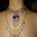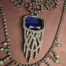 This fabulous huge art deco buckle is the perfect centerpiece for these vintage rhinestone necklaces with dripping teardrops and huge swags. As a chandelier necklace, it has two layers of fabulous vintage rhinestones, and as a separates, you get two different necklaces. A huge blue faceted glass center stone sits at the tops of dripping rhinestone rays that give this the most dramatic effect. The pendant measures a whopping 3" long and 1 1/3" wide. I attached it to the swag choker that measures 15" long and is 1 1/4" wide. The second necklace which is attached at each side with fold over clasps, measures 15" long an is 2" at its widest. A fabulous assemblage piece that is one of a kind and as dramatic as it gets! The two large necklaces have all their stones ( less a few from the clasp) . The huge buckle is all original with a few stones missing. You can hardly tell since the original silver plating is in the holes. I didn't want to change the original condition since it seemed to give it so much character.