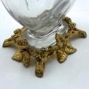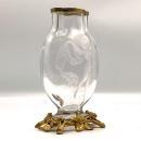 Our lovely antique vase, attributed to Baccarat, possibly for Escalier de Cristal, has a flattened round shape with the engraved figure of a neoclassical nude maiden, with gilt silver rim and footed organic style pedestal depicting fruit bearing branches. Worn makers mark in diamond cartouche with two French silver guarantee marks, and apparently no signature on the glass. In good condition, with noticeable rubbing wear to the gilding and glass in excellent condition. 6 3/8 by 3 1/2 by 2 1/2 inches (16.1 by 8.9 by 5.6 cm).