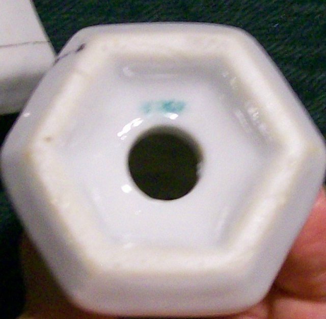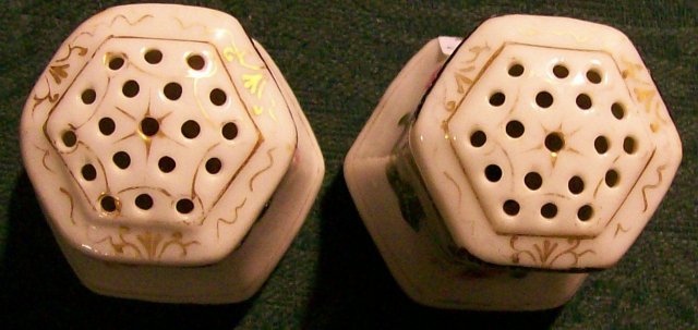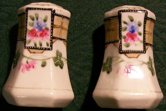 Hand painted salt & pepper shakers, made in Japan, circa 1920's. Floral vignettes & clover with trellis, gold trim. Flared hexagon shape. Smeared green marks on bottom. Measure 3"h. Some wear to the gold as shown. No cracks or chips, no stains. Inglenook Antiques...Established 1989.