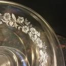 Set of 3 Pyrex, nested, mixing bowls feature white daisies against clear glass. The pattern is called Colonial Mist. This set is from the 1970’s . The bowls have a hand grip rim.