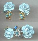 Set(s)/Demi/Goldtone W/Molded Aqua Roses&Teal Rhinestones/Ear Clips/Brooch