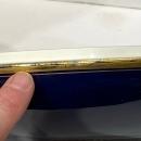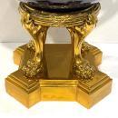 Our beautiful potpourri or cassolette in porcelain with cobalt blue glaze and ormolu bronze mounts stands an impressive 21 in (53.3 cm) tall and features an acanthus leaf finial, pierced guilloche motif with large scrolling handles, set upon a base with reed-and-tie motif, leaf cast legs with paw feet on a plinth pedestal. Underside of the lid shows a spurious double-l mark of Sevres and the inside of the bowl is gilt metal, apparently lacquered brass.