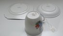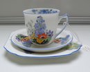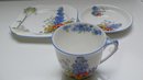 Beautiful Shelley Bone China Garden Urn Flowers Trio in excellent condition with no cracks or chips. The saucer measures 5 1/2" and the bread and butter plate is 6 1/4"